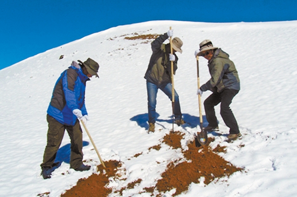 近期,西勘院阿克楚克賽項目順利推進。該項目組的11名組員,在5月19日到達工區(qū)后,克服工區(qū)高海拔等惡劣工作環(huán)境,3天外業(yè)1天內(nèi)業(yè)(外業(yè)每天近10小時),在覆蓋過厚的地區(qū)每天能采樣100余個,做到每坑見層位,平均坑深在1m以上;覆蓋較淺地區(qū)采樣數(shù)一般在150個左右。預計到7月底可完成土壤樣3681件。