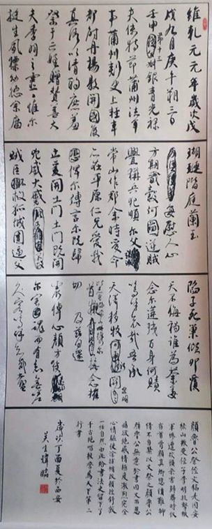 書法入展獲獎(jiǎng)情況:1997年6月參加周至縣書協(xié)舉辦的慶祝香港回歸書法大賽獲優(yōu)秀獎(jiǎng);?2007年《陜西地質(zhì)報(bào)》刊登書法斗方草書“廉”。?2011年7月陜西省老年書畫學(xué)會(huì)書畫展獲優(yōu)秀獎(jiǎng);2016年5月,撰寫論文《淺議寫字與書法之關(guān)系》入編陜西省老年大學(xué)《書法論文感言集》;2017年,臨帖作品顏真卿《祭侄文稿》入選陜西省書法家協(xié)會(huì)舉辦的陜西省第五屆書法篆刻臨作展。