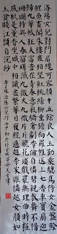 自幼酷愛書畫,小學(xué)一年級(jí)起每天寫“一盤方”,老師悉心教授書法,總是希望老師能多劃幾個(gè)紅圈。文革停課鬧革命,從此中斷了寫大字。但是,文革期間,如毛主席的“四海翻騰云水怒,五洲震蕩風(fēng)雷激”的詩(shī)詞書法到處可以看到,從此我愛上了龍飛鳳舞的字體。十四歲我當(dāng)上了羊倌,生產(chǎn)隊(duì)給我分了十五只羊,把羊放到山坡上吃草。我用攔羊小镢頭在崖上刮平一塊地方開始練毛主席的草書。黃土崖幫了我,可是羊吃了鄰村的莊稼闖了禍。八十年代,春節(jié)前夕擺攤子賣對(duì)聯(lián),練了字,收入補(bǔ)貼家用。有一天,地?cái)偳皝砹艘蝗?,看我寫字,最后他提出寫兩幅?duì)聯(lián),他一邊寫字,一邊說:你看我寫字的運(yùn)筆方法,他寫的字型很好,后來就揣摩他的寫字法,多年后才明白,我在地?cái)偳暗玫筋侒w筆法傳授。多年來潛心學(xué)習(xí)書法,業(yè)余苦練不輟,自足自樂。上追魏晉,碑帖兼修,長(zhǎng)期臨習(xí)《圣教序》、《蘭亭序》、《十七帖》。顏魯公的《勤禮碑》、《自書告身帖》、《爭(zhēng)坐位》、《祭侄文稿》等,還學(xué)習(xí)了智永《千字文》、于右任《標(biāo)準(zhǔn)草書》,喜歡鄭板橋、何紹基書風(fēng)。2015年起先后在陜西省老年大學(xué)、天朗中老年大學(xué)書法班學(xué)習(xí),豐富了書法知識(shí),增強(qiáng)了信心,對(duì)學(xué)習(xí)書法藝術(shù)提高了認(rèn)識(shí),上了一個(gè)臺(tái)階。